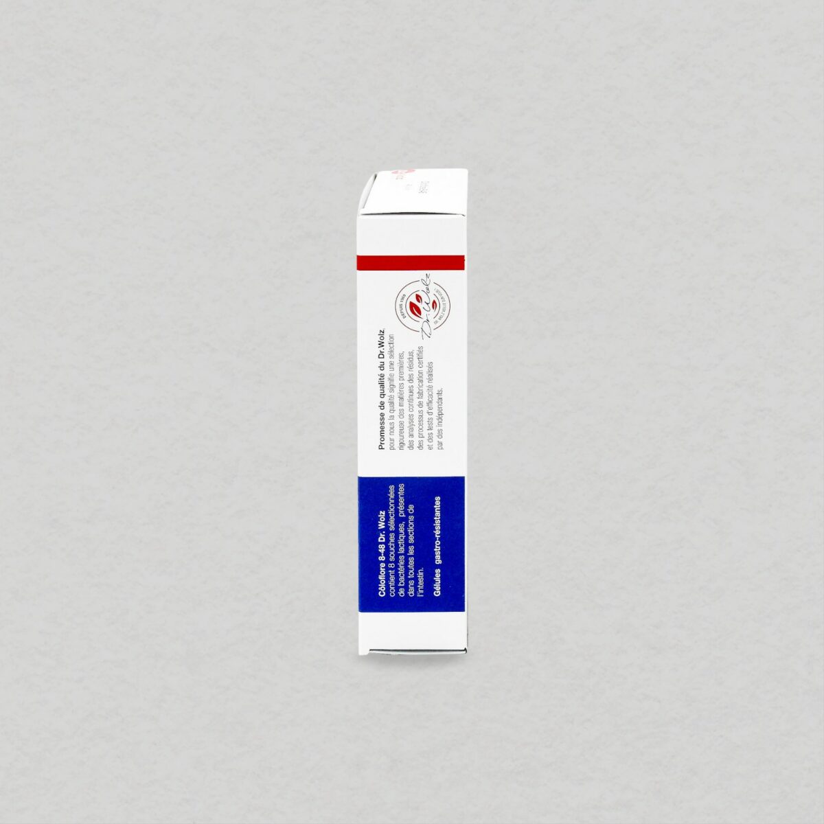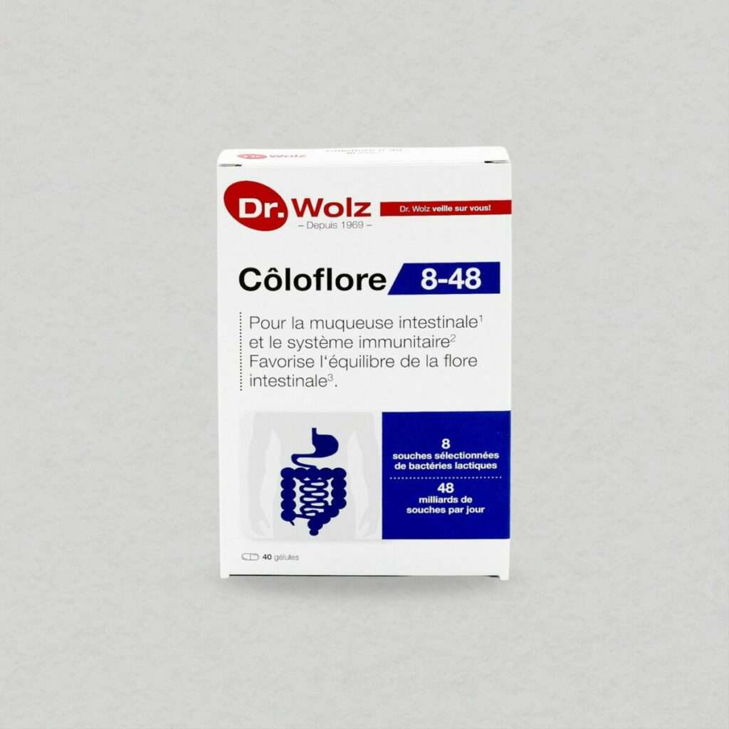 Côloflore 8-48. 2 capsules (24 milliards de bactéries lactiques) suffisent en cas de prise permanente. Les bactéries lactiques ne s’installent pas de manière permanente dans le côlon. C’est pourquoi nous recommandons d’utiliser Côloflore 8-48 Dr. Wolz pendant quelques mois. Cela garantit le soutien de la fonction de la flore intestinale et l’amélioration de l’équilibre du microbiote intestinal.