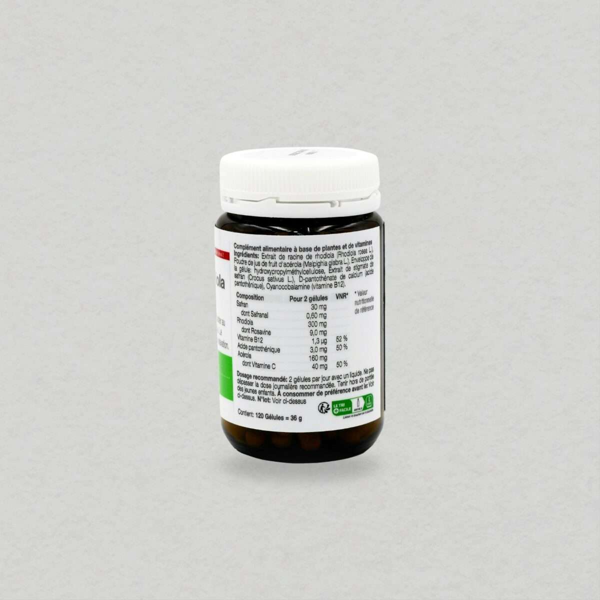 Deux gélules contiennent 30 mg d’extrait de fil de safran (dont Safranal 0,6 mg) ; Extrait de rhodiola 300 mg (dont rosavine 9,0 mg) ; Vitamine B12 1,3 µg, acide pantothénique 3,0 mg, vitamine C 40 mg. L’extrait de Safran+Rhodiola est végétalien. L’enveloppe de la capsule est constituée de cellulose végétale.